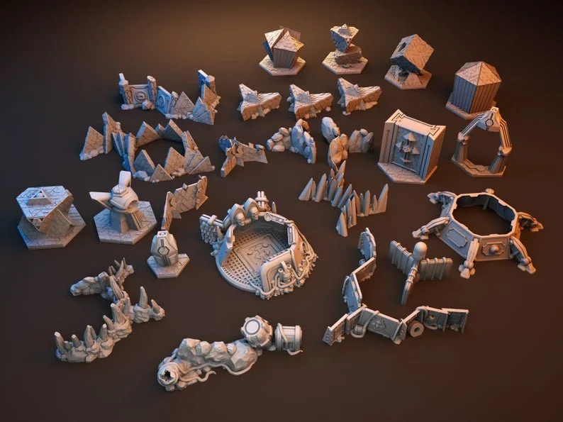 The Trihex Citadel Token Edition is Blackstone Fortress compatible and contains a set of 33 tiles, scatter terrain, token and markers all scaled to use directly on or as additions to your 62mm hexagon cardboard game tiles. Each of the pieces included in this set are individual unique sculpts.