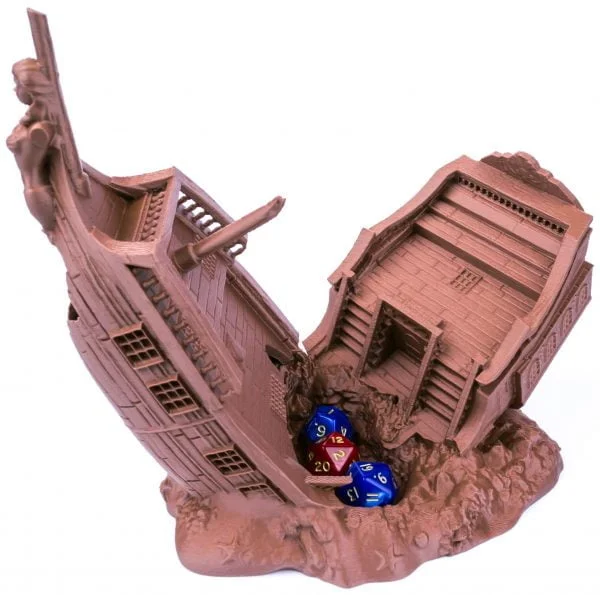 Sunk Pirate Ship Dice Tower – a one-of-a-kind dice tower that is sure to impress your friends and fellow gamers. This dice tower is modeled as if it were a pirate ship that has been broken apart and sunk to the bottom of the ocean. It is designed to keep your dice rolling smoothly and prevent them from scattering all over the table.